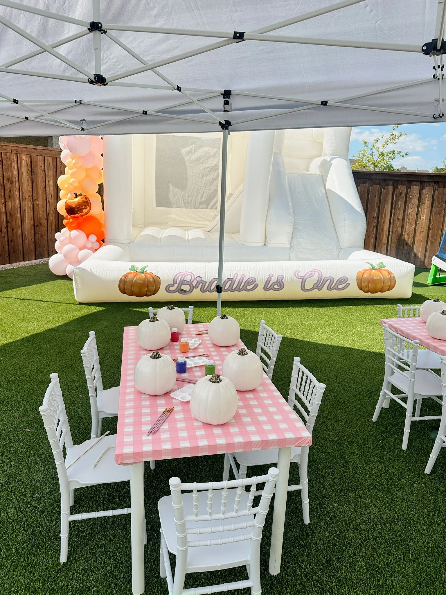 As event planners, there’s nothing more fun than creating a memorable celebration for a little one’s first birthday! Recently, we had the pleasure of organizing an adorable “Our Little Pumpkin is One” party with a pink and orange theme. From a bounce house to pumpkin painting, every detail was designed to be both playful and picture-perfect. Here’s how we brought this special day to life!